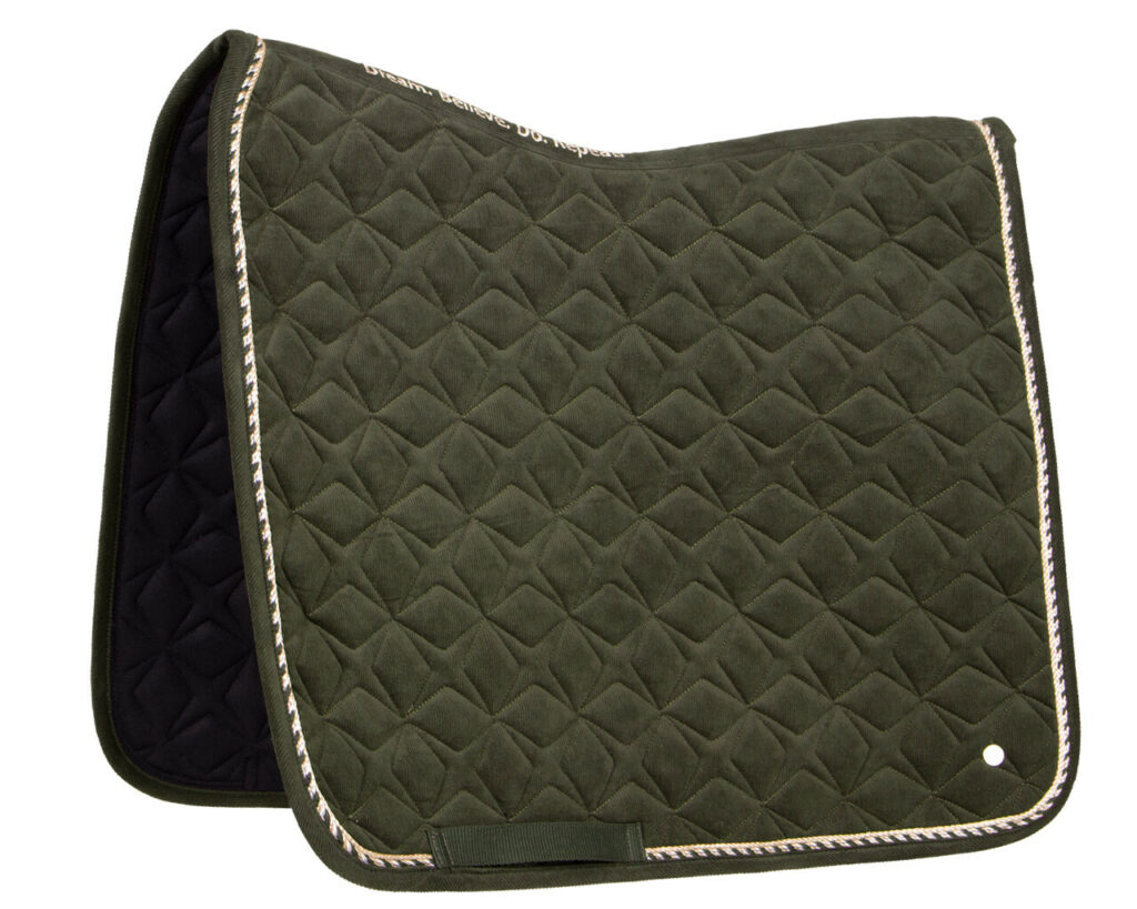 Tapis de selle chic pour les cavaliers qui veulent briller lors d’une séance. Le velours côtelé et les deux cordons décoratifs créent un look élégant. Le tapis de selle est équipé de boucles de sangle qui garantissent qu’il reste bien en place.