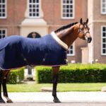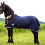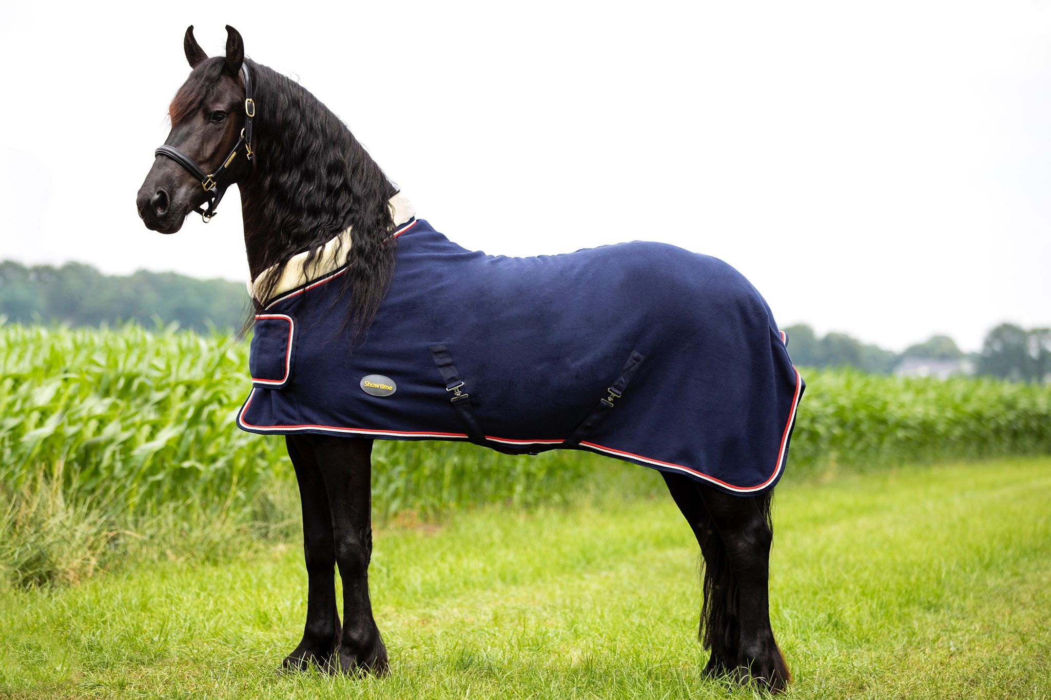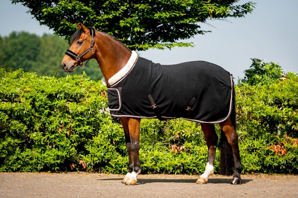 Couverture de luxe en matériau softshell. En raison de la surface lisse, le foin et la litière ne colleront pas à la couverture. Elle possède une doublure en polaire et un col doux en fourrure synthétique. Les fermetures sont faites de cuir d’imitation pour une touche chic supplémentaire. La couverture est finie avec une pièce de diamant et cordon décoratif torsadé.